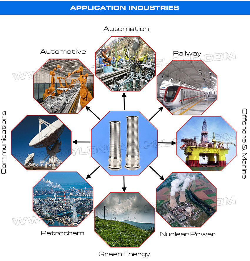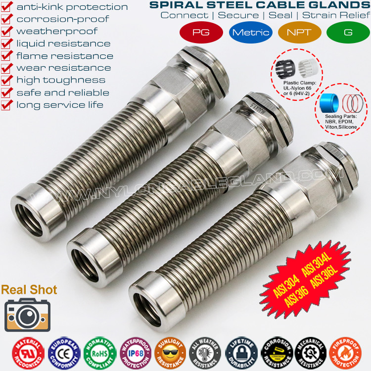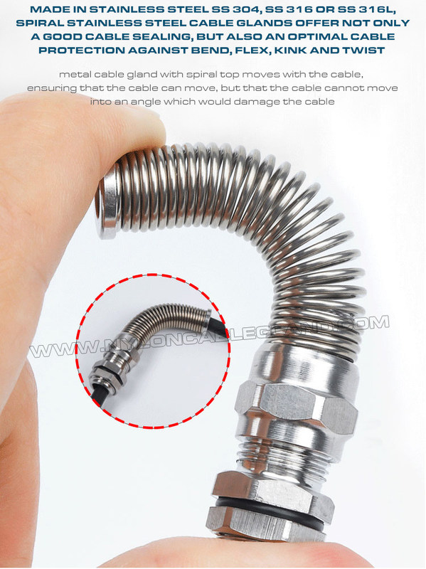 Οι σπειροειδείς μεταλλικοί στυπιοθλίπτες καλωδίων από ανοξείδωτο χάλυβα με προστασία από συστροφή και συστροφή έχουν την ικανότητα χημικής αντοχής, αντοχής στη διάβρωση και αντοχή στη θερμότητα και έχουν επίσης την ικανότητα υψηλής αντοχής σε εφελκυσμό, υψηλής αντοχής, καλής αντοχής στο νερό, εξαιρετικής προστασίας κάμψης και μεγάλου χρόνου συντήρησης . Είναι ανθεκτικά στη σκόνη, βρώμικα, θαλασσινό νερό, οξύ, οινόπνευμα, λάδι, γράσο και κοινό διαλύτη. Είναι δημοφιλείς στις εφαρμογές της ναυπηγικής, των ηλεκτρικών και ηλεκτρονικών τεχνολογιών, των τηλεπικοινωνιών, του αυτόματου ελέγχου, των τροφοδοτικών, των ηλιακών φωτοβολταϊκών μονάδων, των μετατροπέων, των φωτιστικών, των καμερών παρακολούθησης, των μηχανικών εγκαταστάσεων, των μηχανημάτων και άλλων σκληρών ή διαβρωτικών περιβαλλόντων κ.λπ.