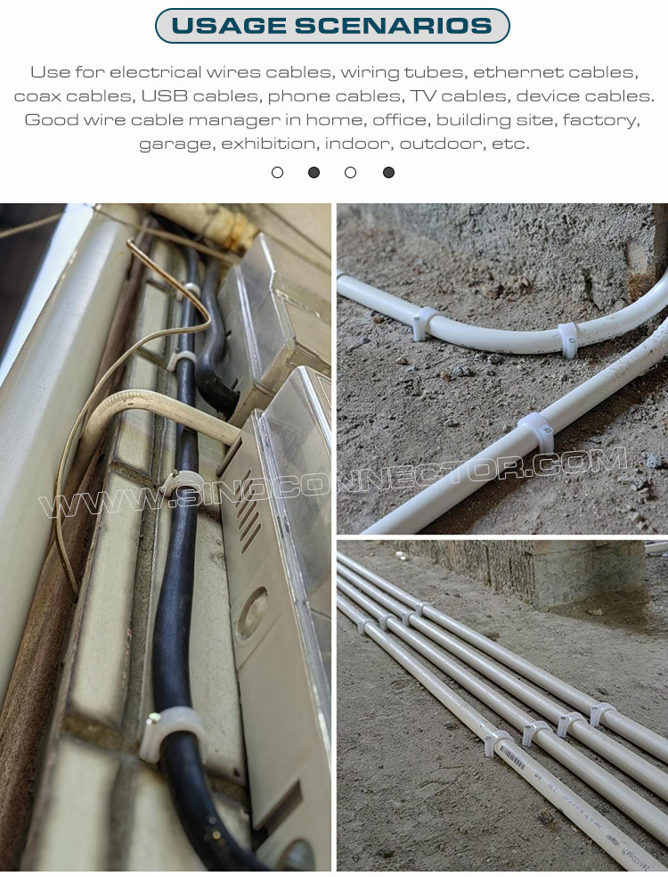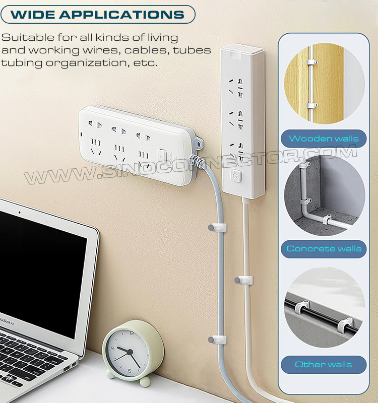 Τέτοιες βάσεις καλωδίων ή οργανωτές καλωδίων είναι ιδανικές για ομοαξονικό καλώδιο RG8X, RG58, RG59 ή LMR 240, ομοαξονικό καλώδιο ψηφιακού βίντεο ή ήχου RG6, καλώδιο δικτύου Ethernet Cat 5, καλώδιο δικτύου Cat 6, καλώδιο ηχείων, καλώδιο τηλεφώνου, καλώδιο USB, χριστουγεννιάτικο φως κ.λπ. Κάντε το σπίτι σας πιο τακτοποιημένο και ελευθερώστε πολύ χώρο. Το τακτοποιημένο καλώδιο μπορεί επίσης να βελτιώσει την ασφάλεια της χρήσης ηλεκτρικής ενέργειας και να προστατεύσει την ασφάλεια των μελών της οικογένειας, ιδιαίτερα των παιδιών.