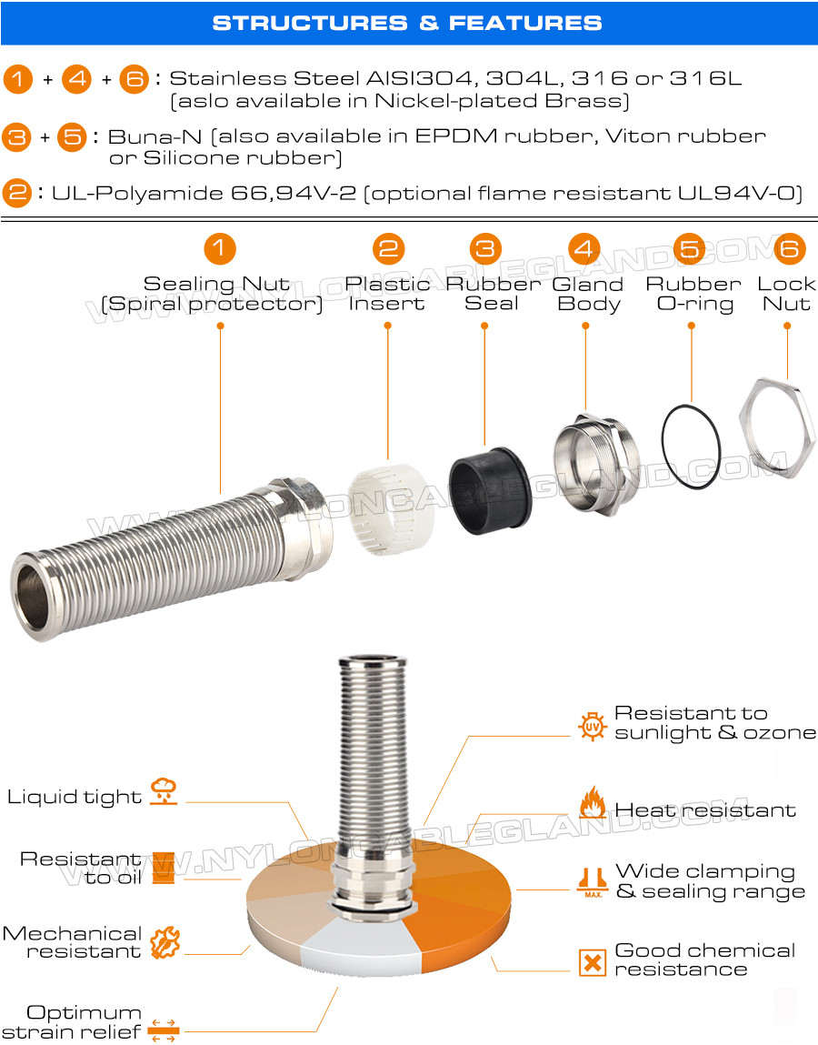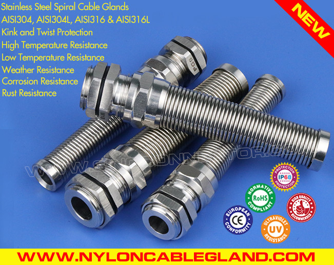 Με πλεονεκτήματα υψηλής αντοχής στην κρούση και μεγάλου εύρους σύσφιξης, αντοχής σε υψηλές και χαμηλές θερμοκρασίες και αντοχή στις καιρικές συνθήκες, IP68 στεγανοί μετρικοί στυπιοθλίπτες καλωδίων σύνδεσμος καλωδίου M12~M50 από ανοξείδωτο χάλυβα τύπου 304/316/316L με προστασία από τσάκιση και κάμψη συνοδεύονται από ένα πρόσθετο σπειροειδές προστατευτικό ελατήριο και έχει την ικανότητα της χημικής αντίστασης, της αντοχής στη διάβρωση και της αντοχής στη θερμότητα, και έχει επίσης την ικανότητα υψηλής αντοχής σε εφελκυσμό, υψηλής αντοχής, καλής αντοχής στο νερό, εξαιρετικής προστασίας κάμψης και μεγάλου χρόνου συντήρησης.