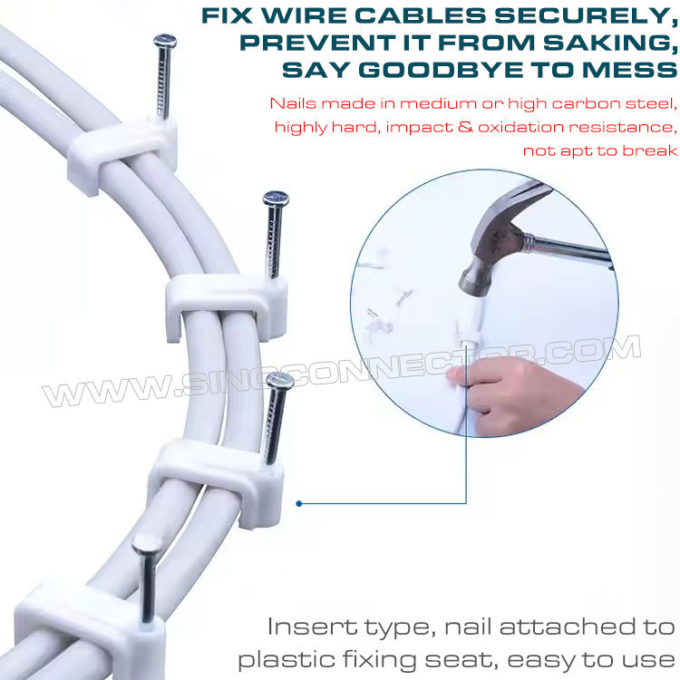 Τα επίπεδα κλιπ καλωδίων με ένα μόνο καρφί τσιμέντου χρησιμοποιούνται για τη στερέωση και την οργάνωση μακριών καλωδίων, κορδονιών, καλωδίων ή σωλήνων σε μια επιφάνεια, για να τα κρατούν τακτοποιημένα και οργανωμένα, προστατεύοντάς τα από ζημιές και αποφεύγοντας τους κινδύνους ταξιδιού. Συνήθως διατίθενται σε υλικό PE (πολυαιθυλένιο), διαφορετικά χρώματα και διάφορα μεγέθη για να χωρέσουν διαφορετικούς τύπους και ποσότητες συρμάτων, καλωδίων ή σωλήνων. Τα επίπεδα κλιπ κορδονιού σχεδιάζονται συνήθως ως μικρές, στιβαρές συσκευές που μπορούν να στερεωθούν σε επιφάνεια όπως τοίχο, γραφείο ή άλλες κατασκευές. Διαθέτουν κεντρικό κανάλι ή άνοιγμα όπου μπορεί να μπει το καλώδιο.