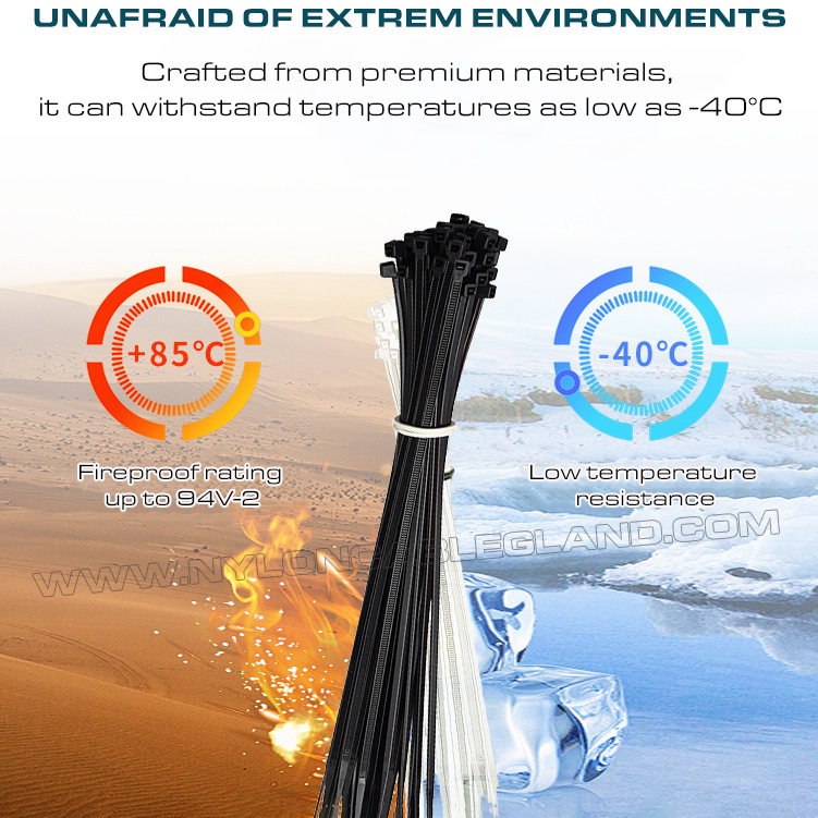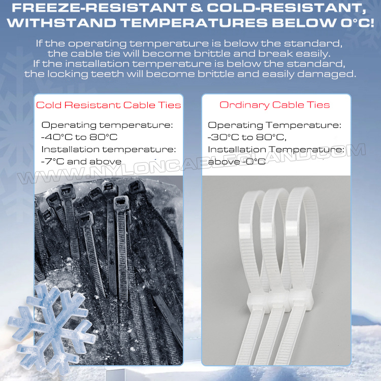 Οι δεματικοί καλωδίων ανθεκτικοί σε χαμηλές θερμοκρασίες (γνωστοί και ως δεματικοί καλωδίων ανθεκτικοί στην ψύξη ή δεματικοί καλωδίων ανθεκτικοί στον παγετό) είναι δεματικοί καλωδίων σχεδιασμένοι για κρύα περιβάλλοντα. Είναι κατασκευασμένοι από ειδικά νάιλον υλικά ανθεκτικά σε χαμηλές θερμοκρασίες (όπως τροποποιημένα υλικά PA6.6). Τα πλεονεκτήματά τους περιλαμβάνουν εξαιρετική αντοχή σε ψυχρά κρούσεις (αντίσταση σε εύθραυστα θραύση), υψηλή αντοχή, υψηλή αντοχή στη φθορά, καλή διαστατική σταθερότητα και εξαιρετική χημική αντοχή και ηλεκτρικές ιδιότητες. Μπορούν να διατηρήσουν την αντοχή, την ανθεκτικότητα και την αντοχή τους στην εύθραυστη κατάσταση σε εξαιρετικά χαμηλές θερμοκρασίες (όπως -40°C) χαμηλότερες από το τυπικό νάιλον. Χρησιμοποιούνται ειδικά για την επισκευή εξοπλισμού σε κρύες περιοχές ή σε βιομηχανικούς τομείς που απαιτούν απόδοση υλικών σε χαμηλές θερμοκρασίες για να διασφαλιστεί ότι τα αντικείμενα είναι σταθερά στερεωμένα και ασφαλή.