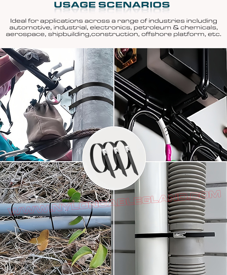 • Ναυπηγική και ναυπηγική μηχανική: δέσμη συρταριών καλωδίων· ενίσχυση πυροσβεστικών σωλήνων· στερέωση εξοπλισμού και καλωδίων σε διαβρωτικά θαλάσσια περιβάλλοντα όπως αλατονέφωση.