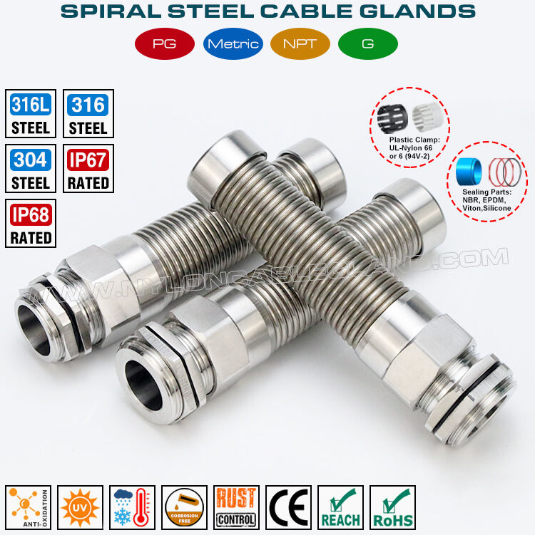 Οι εύκαμπτοι στυπιοθλίπτες καλωδίων από ανοξείδωτο χάλυβα (επίσης γνωστοί ως σπειροειδείς στυπιοθλίπτες καλωδίων από ανοξείδωτο χάλυβα) είναι προστατευτικά εξαρτήματα που χρησιμοποιούνται στη σύνδεση μεταξύ καλωδίων και εξοπλισμού. Τα κύρια χαρακτηριστικά τους περιλαμβάνουν την αποτροπή υπερβολικής κάμψης του καλωδίου, την παροχή αδιάβροχης στεγανοποίησης και την κατασκευή τους από ανοξείδωτο χάλυβα. Χρησιμοποιούν ένα ειδικό ελατήριο ή εύκαμπτη δομή για να απορροφούν και να κατανέμουν την τάση στο καλώδιο στην έξοδο, εξασφαλίζοντας παράλληλα τη στεγανοποίηση και τη σταθερότητα της σύνδεσης του καλωδίου. Αποτελούνται από ένα σώμα από ανοξείδωτο χάλυβα, ένα σπειροειδές προστατευτικό, μια στεγανοποίηση, ένα πλαστικό ένθετο, έναν δακτύλιο ο και ένα ασφαλιστικό παξιμάδι.